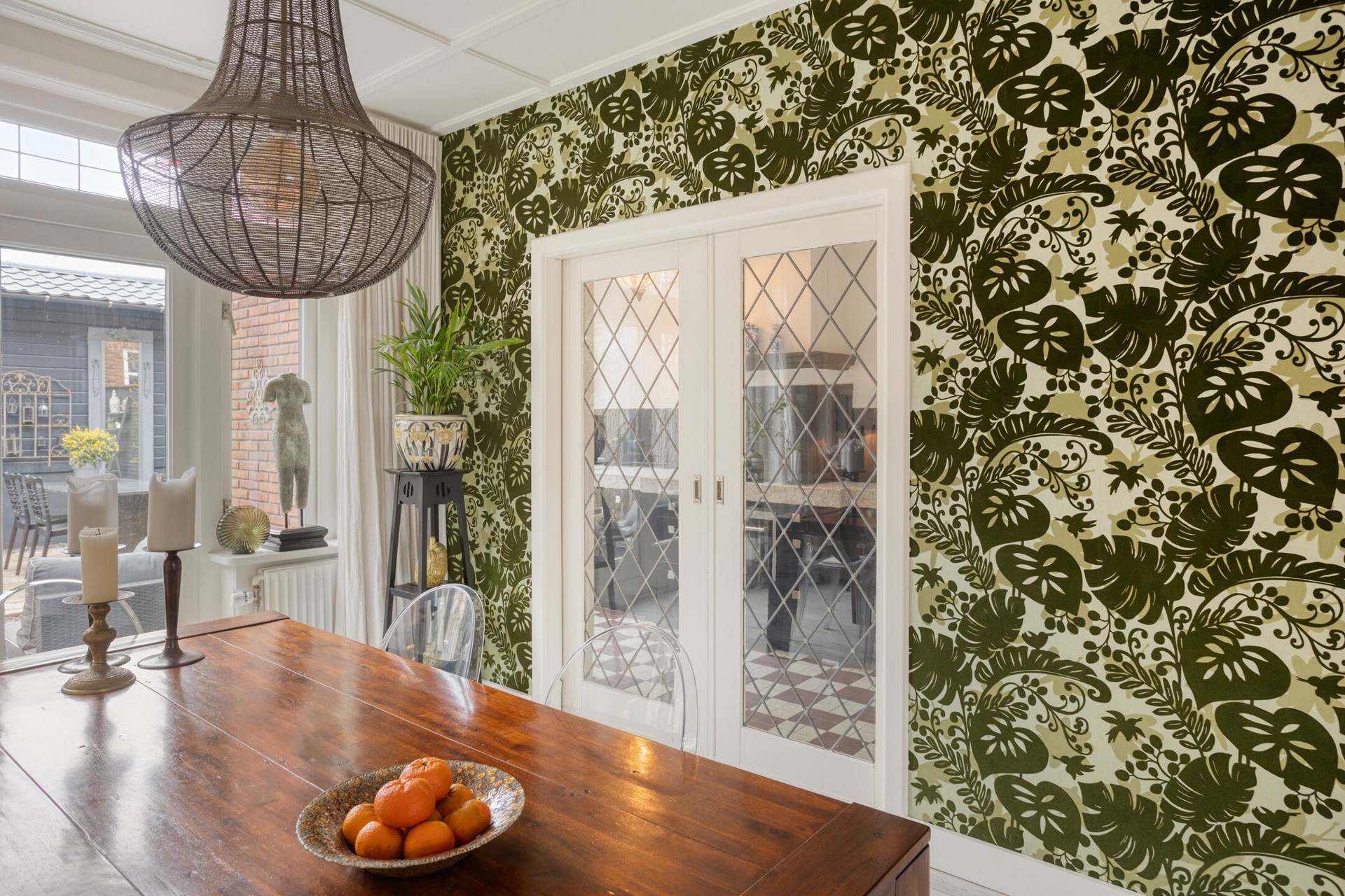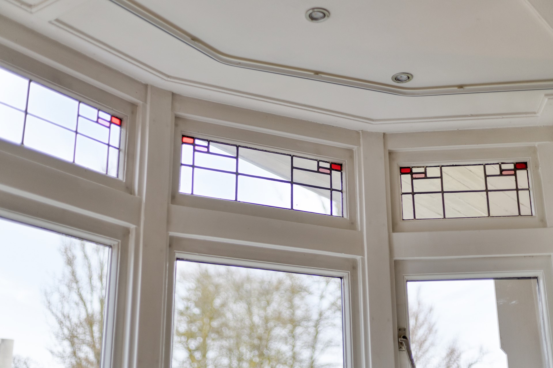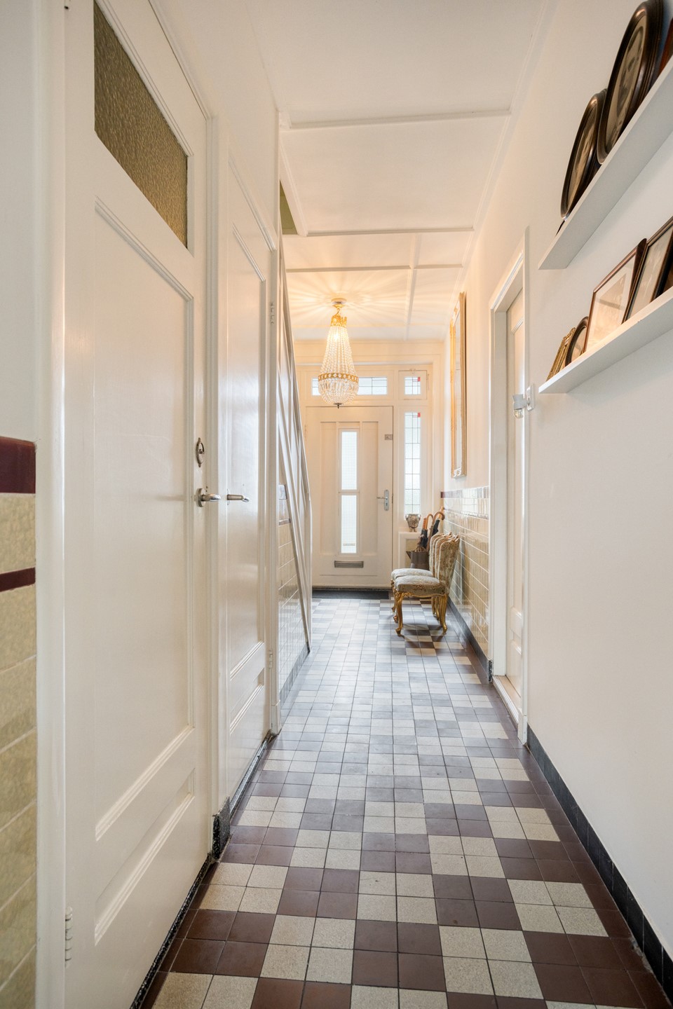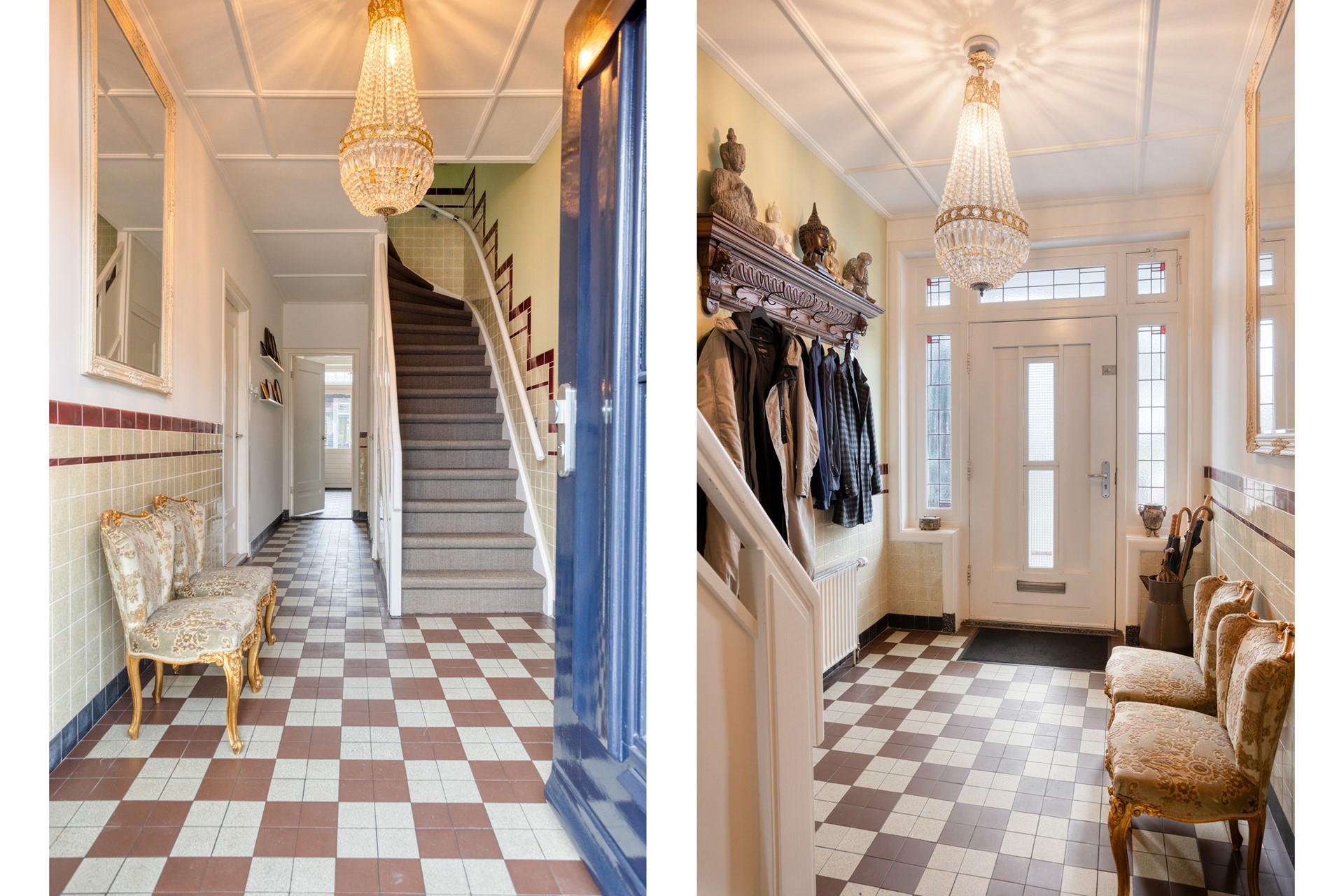 De voordeur ligt beschermd onder een royale overstek. Glas in lood rondom en een granito opstapje, u bent gewaarschuwd, de jaren 30 dienen zich hier al aan. In de hal zijn de kleuren van vloer en wandtegels al 100 jaar geleden op elkaar afgestemd en de bewoner heeft er een uitstekend gevoel voor om dit nog weer te fine-tunen met de inrichting.