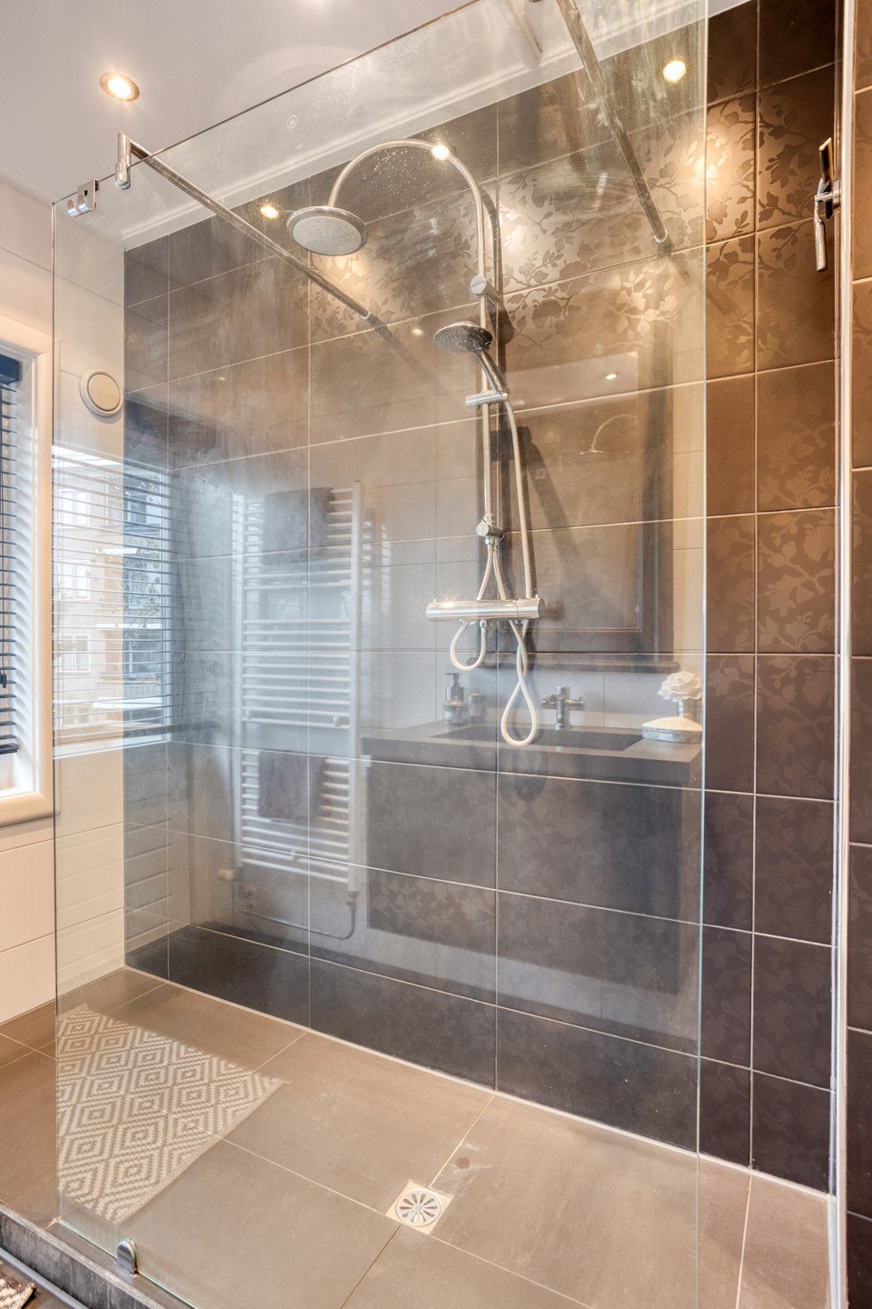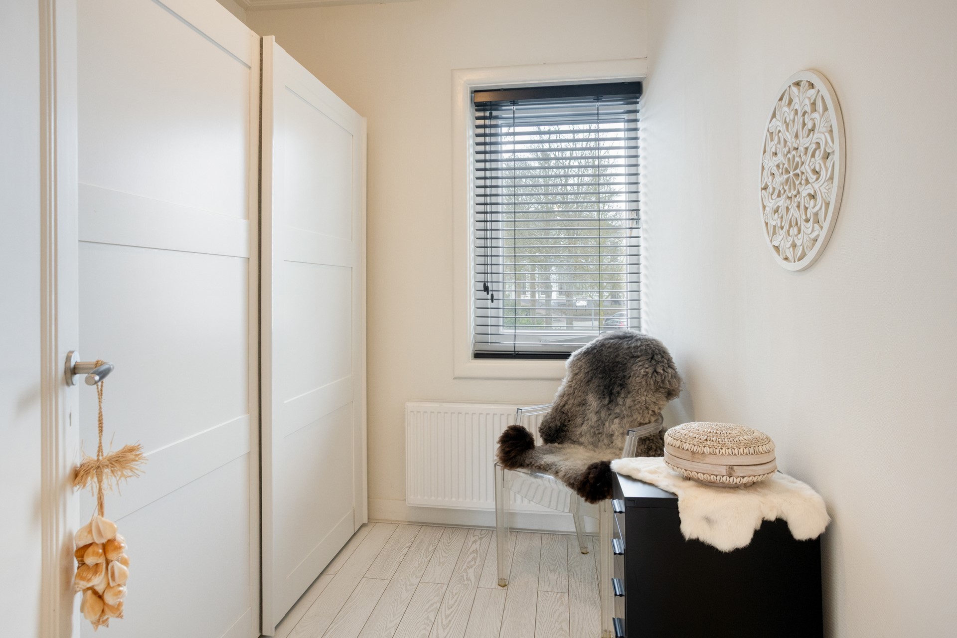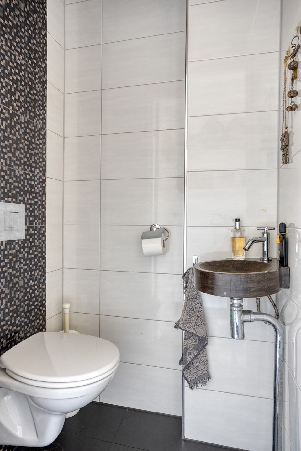Op de eerste verdieping zijn drie slaapkamers met veel ingebouwde kastruimte en een luxe badkamer met balkon. Er is een mooi wastafelmeubel en een inloopdouche achter een glaswand. Geen toilet hier, dat is op de overloop. En als je in bad wilt liggen, zelfs met een ontspannend bubbeltje, moet je een verdieping hoger zijn. De tweede verdieping herbergt namelijk een heerlijke plek met een hoog "loft-gehalte".