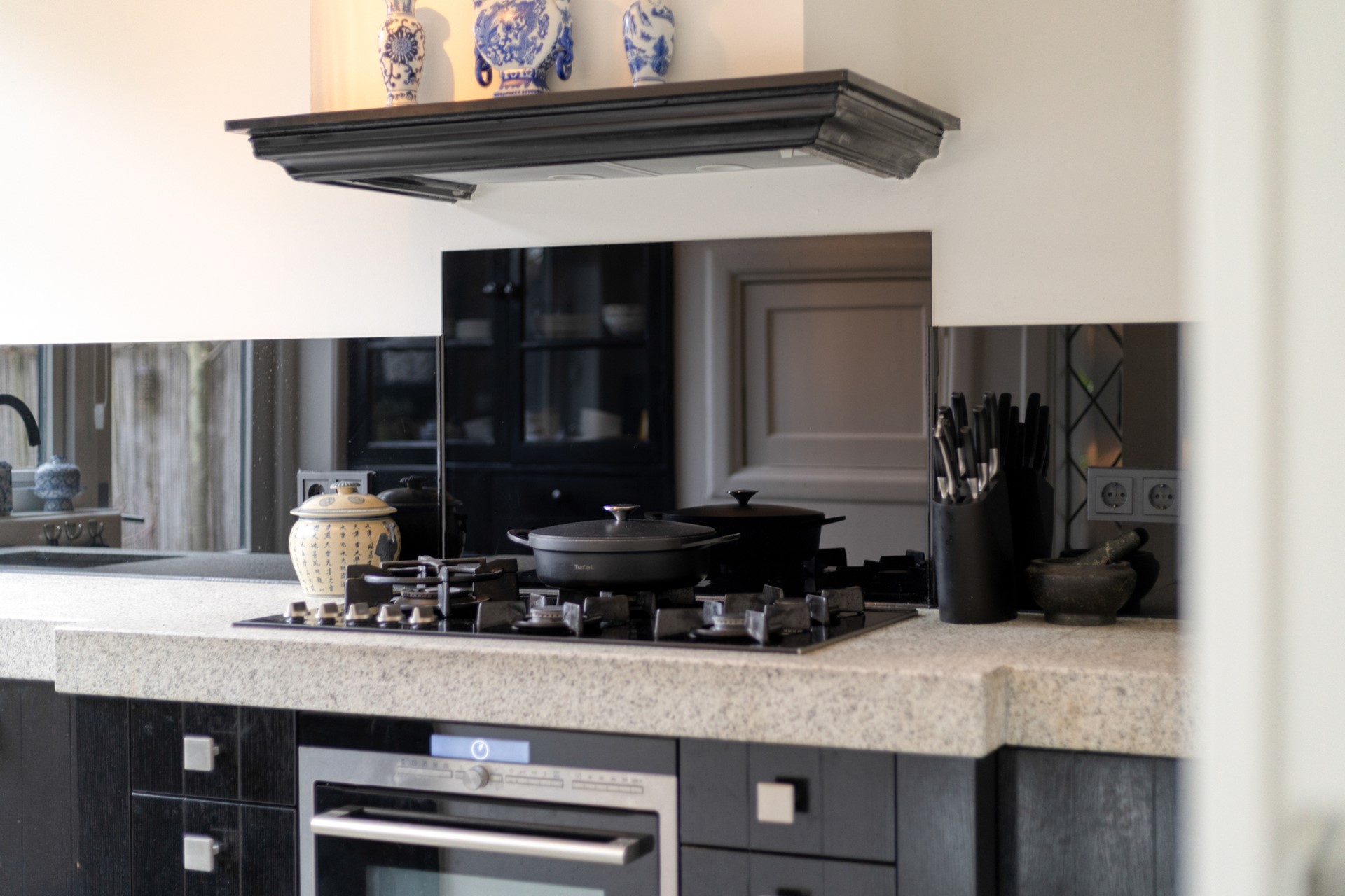 In de hal is het toilet en de toegang tot de praktische kelder. Vanuit de hal is een deur naar de keuken en uiteraard ook een naar de woonkamer. De ronde erker aan de voorkant van de woonkamer zorgt voor veel licht, maar geeft ook een heel ruim zicht op de straat waar de bebouwing op flinke afstand staat. Aan de achterkant open slaande tuindeuren waardoor in de ochtend het vroege zonlicht binnenvalt. Schuifdeuren met glas in lood in ruitvorm scheiden woonkamer en keuken, al staan ze meestal open. De keuken is het aanzien namelijk meer dan waard: Een stoere, degelijke keuken die goed past bij het huis. Moderne uitstraling en inbouwapparatuur en met het granito aanrechtblad wordt er toch weer een knipoog naar het bouwjaar gegeven.