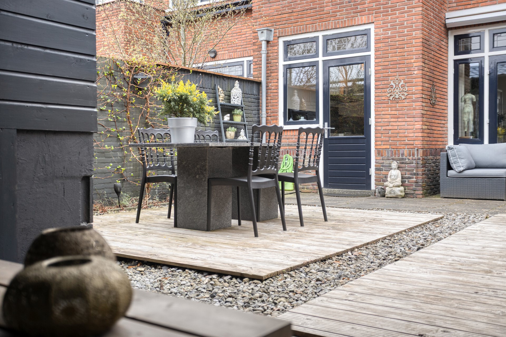 De achtertuin ligt op het zuid/oosten en is zo ingericht dat je optimaal van buiten zijn kunt genieten zonder dat je er veel werk aan hebt. Achterin de tuin is een schuur en een mooie terrasoverkapping. Ook aan het einde van de middag pak je hier de zon nog lekker mee, zeker als die in de zomer weer wat hoger staat. Fietsen en containers kunnen via het achterpad van- en naar de straat. Je auto kan je voor de deur kwijt, in dit deel van de stad mag je vrij parkeren.
