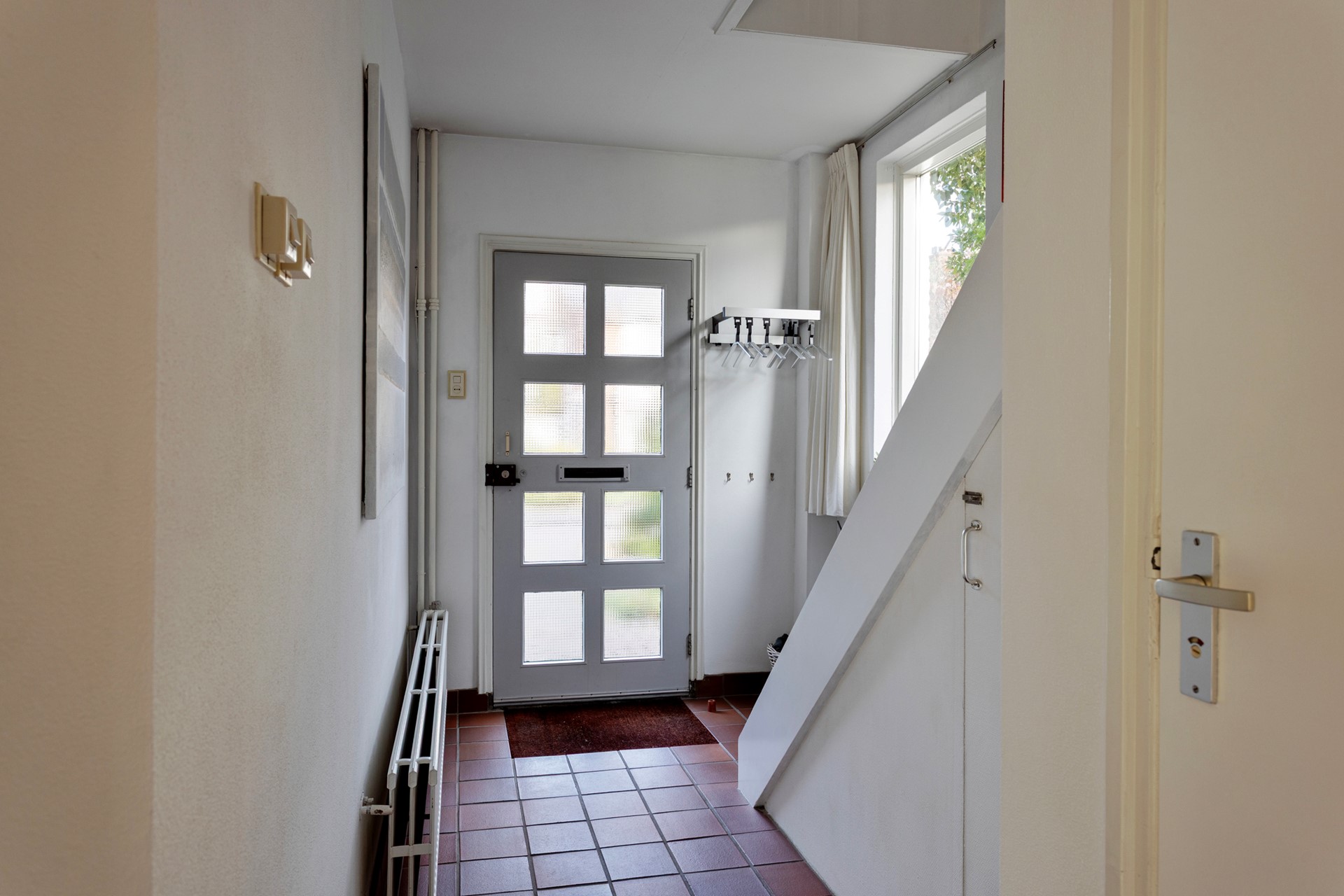 Kom binnen in dit lichte en comfortabele huis. De hal is betegeld, heeft een flink zijraam, toegang tot een ruime kelder en een trap naar de verdieping. Onder de trap is het toilet en een berging.