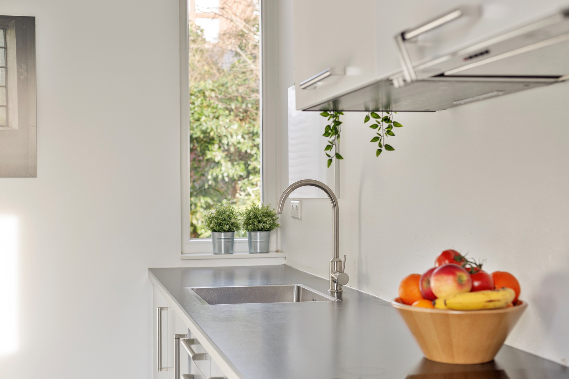 De keuken is, zoals gezegd, in 2015 aangebouwd. Het is een moderne ruimte, ook hier weer veel lichtinval. De zachtgrijze keuken heeft een frisse uitstraling en uiteraard de benodigde inbouwapparatuur. Er is ook genoeg ruimte voor een ontbijttafel, heel gezellig!
