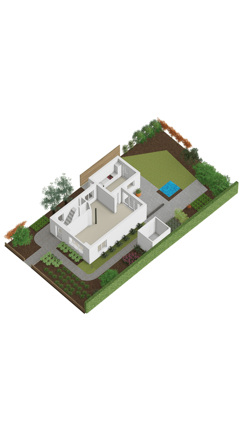 "Een huis zoals een kind een huis tekent", rechte lijnen, witte gevels, een rood pannendak met schoorstenen. Rondom het huis ligt een mooie tuin met een achtergevel op het zuiden. Hier is een beschut terras, een gazon en vooral veel privacy. De vrije ligging is er door het groen van de buurtuinen en het achtergelegen plein met garagebergingen. Dat is pure luxe in een woonwijk!