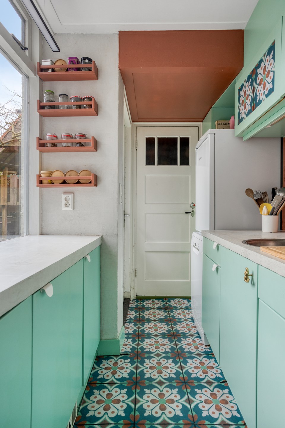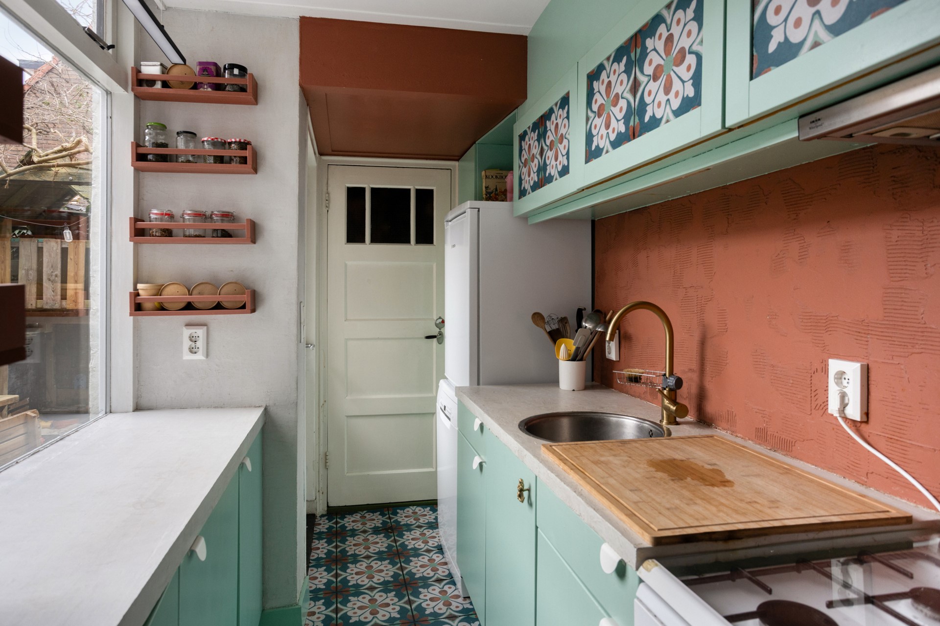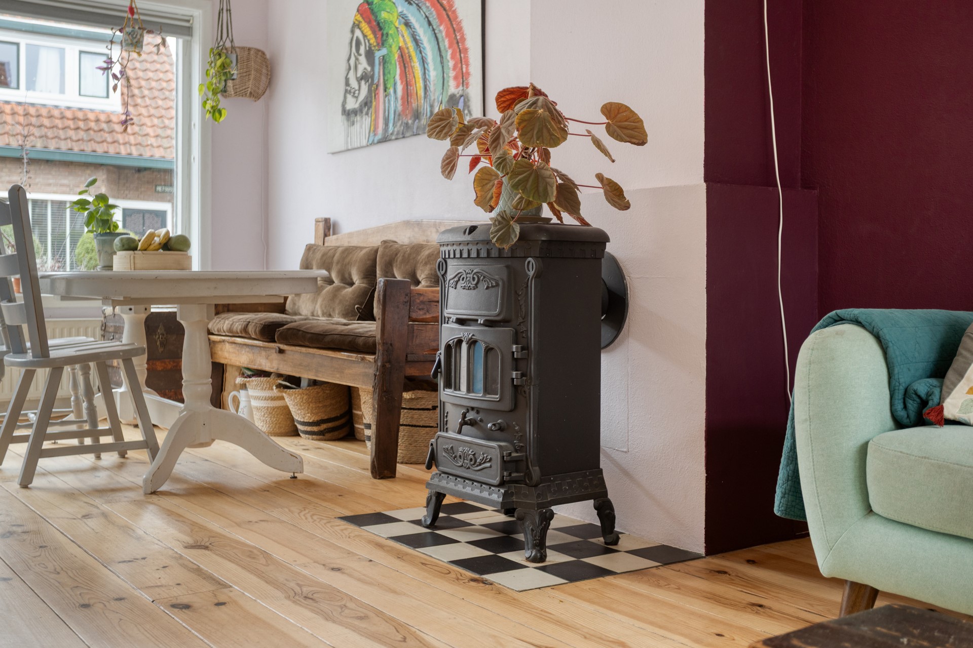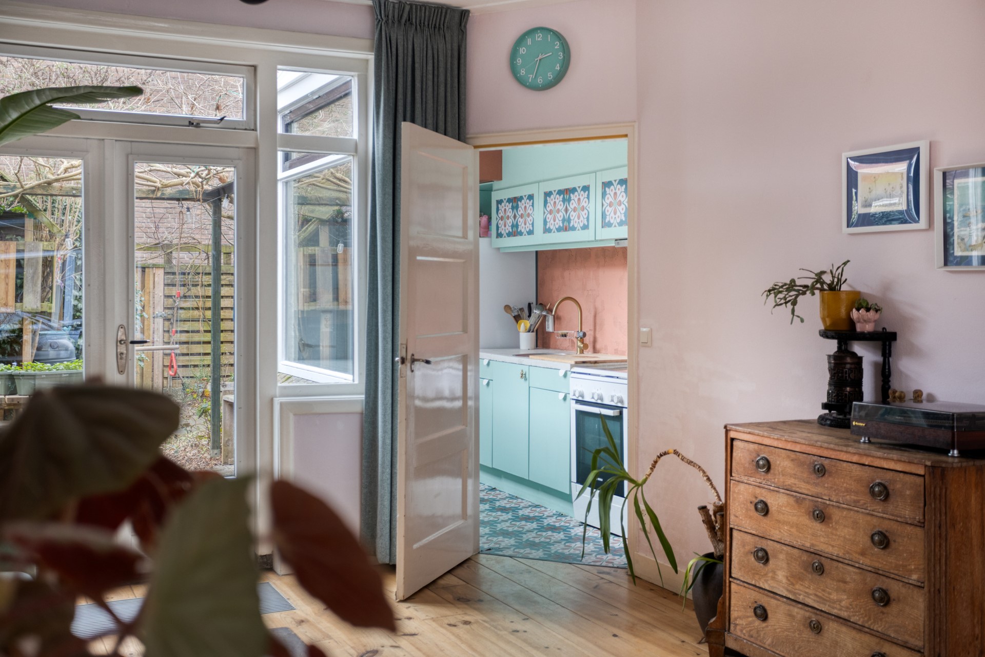 De woonkamer is 25 m2 heeft behalve al die leuke dingen als een erker, een houten vloer en een gezellige gaskachel, ook nog openslaande tuindeuren naar de achtertuin. Over ongeveer twee maanden is het hier prachtig versierd door de Wysteria, of anders gezegd door de Blauwe Regen die over een pergola groeit. De tuin is goed afgesloten met een tuinhek en via de poortdeur kom je in het achterpad. Er is een fietsenschuur, plaats voor je containers, een speelhuisje en dan blijft er nog genoeg ruimte over voor een flinke picknicktafel. Je kunt ook via de aangebouwde keuken naar buiten. De inrichting van de keuken is al wat ouder, maar door het kleurgebruik valt dat eigenlijk niet op. Er is een gasfornuis, een afzuigkap, een vriezer, een koelkast en een vaatwasser.