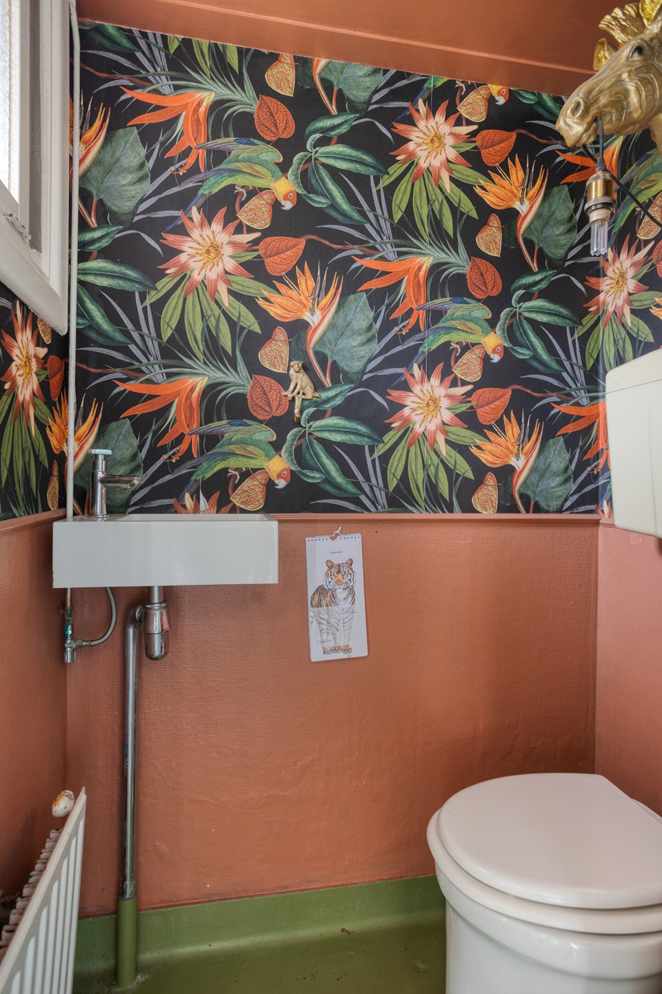 Dit huis maakt je vrolijk. Als je binnenkomt sta je in een hal met zonnig geel geschilderde lambrisering met wit stucwerk daarboven. Net als in de woonkamer ligt ook hier al die mooie warme houten vloer.