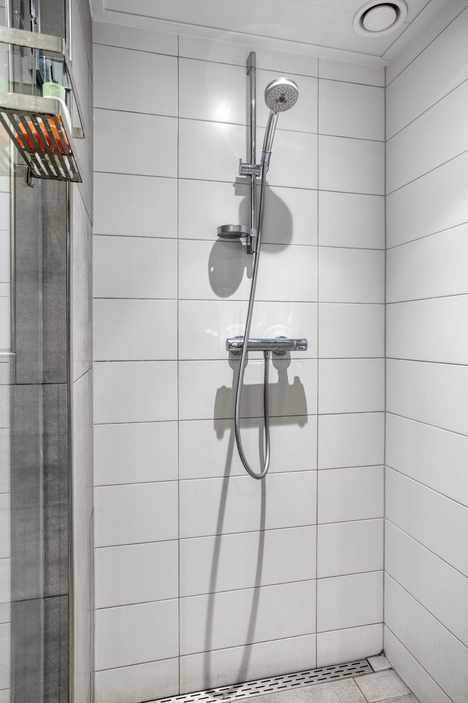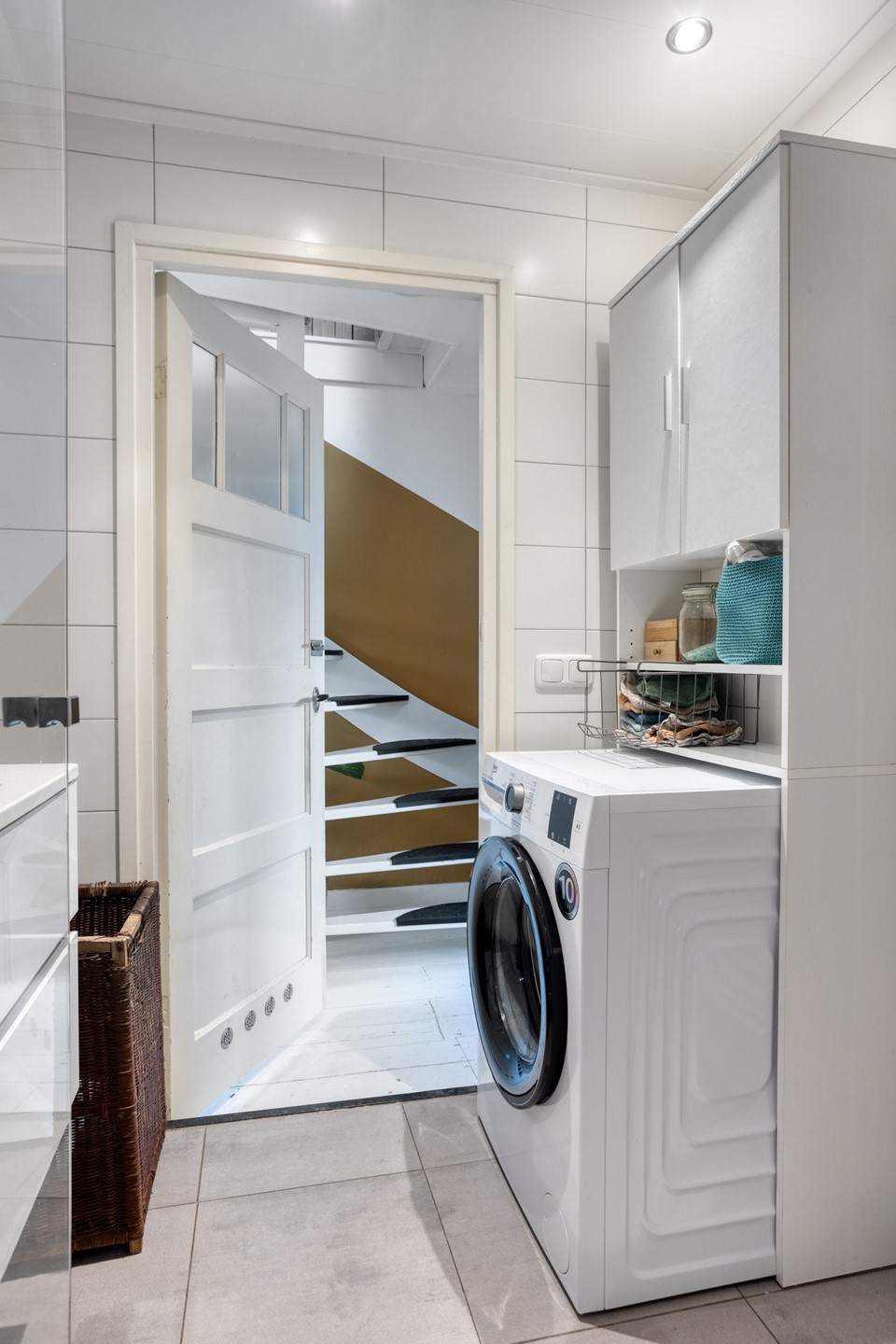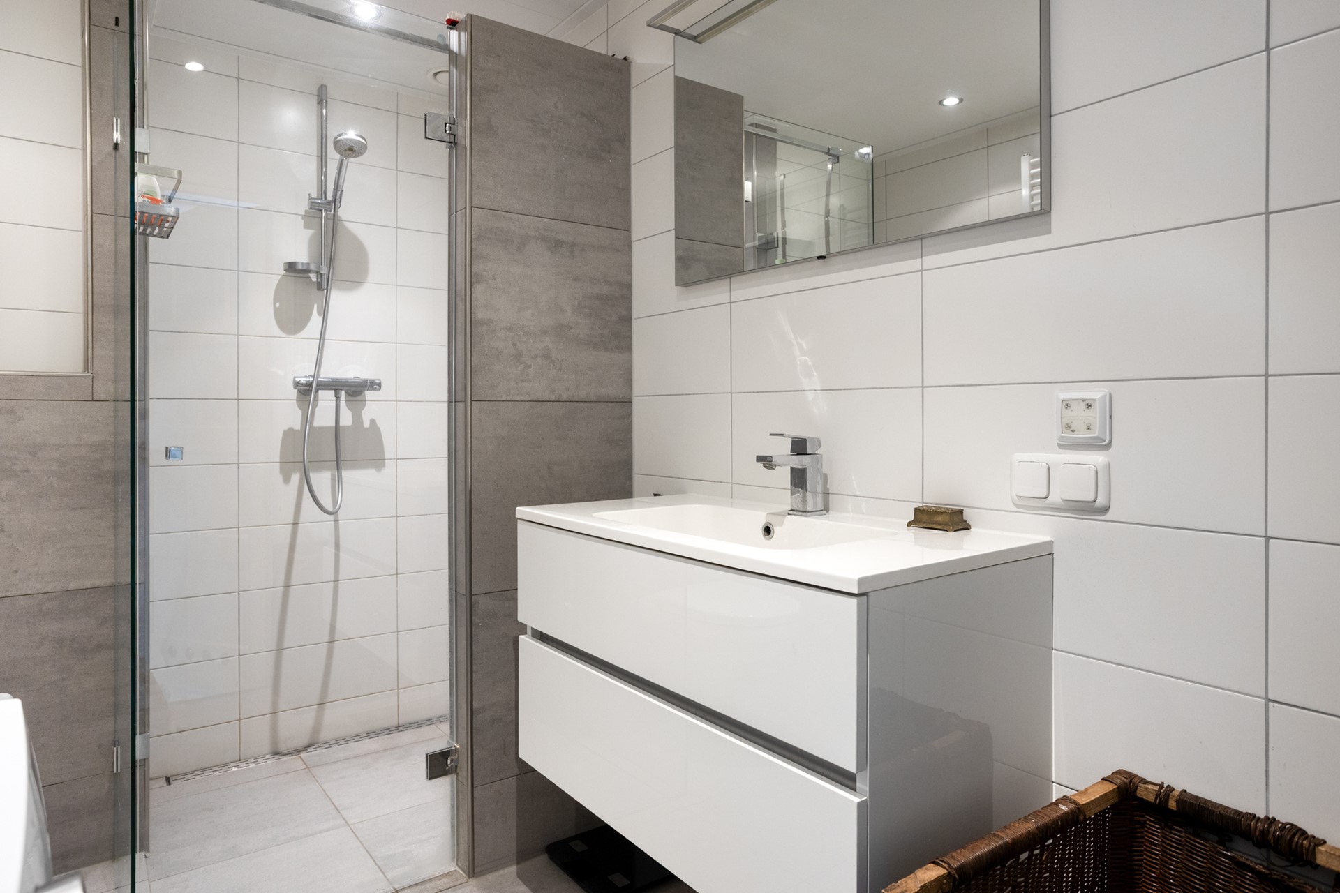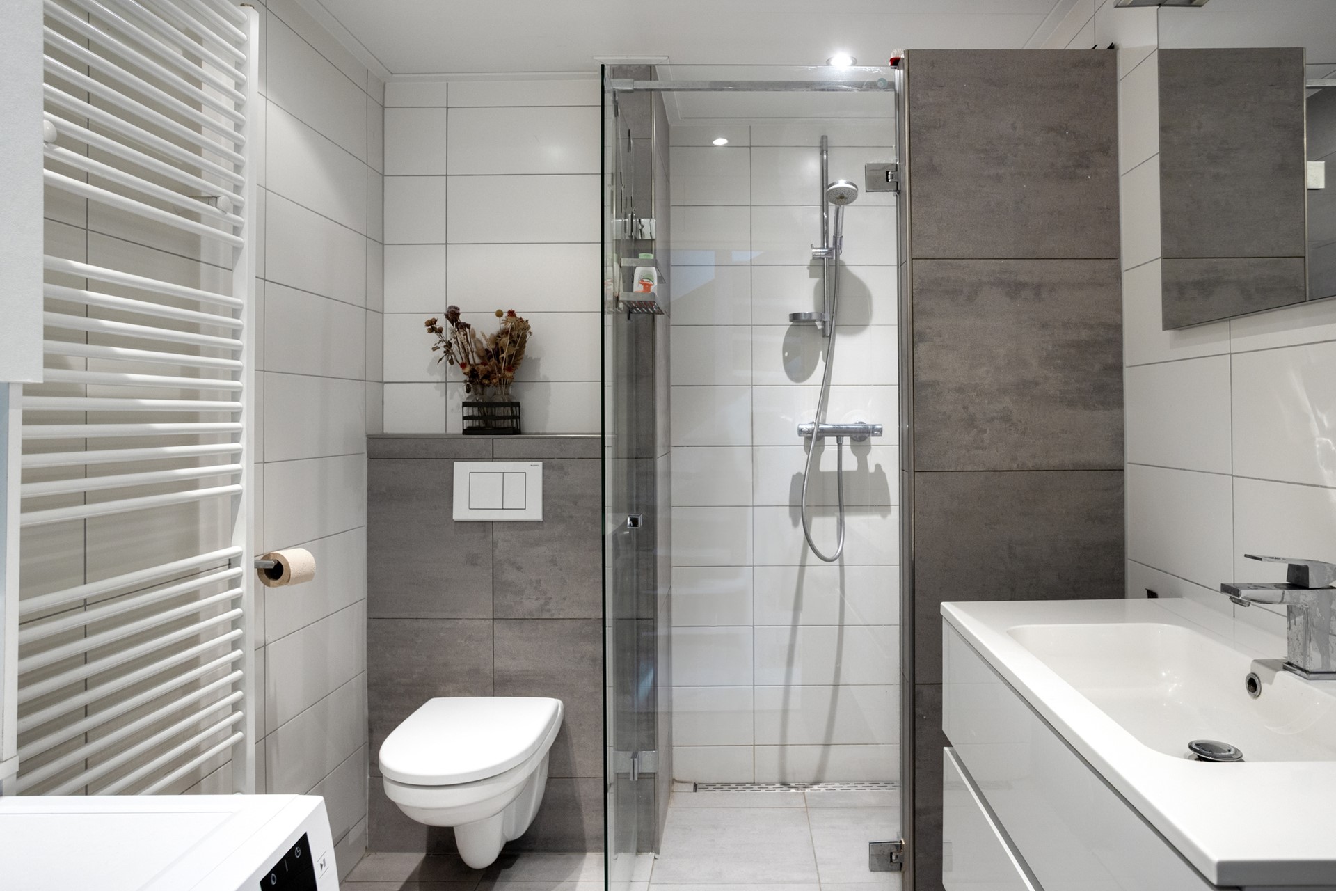 Op de eerste verdieping zijn twee slaapkamers en een goede badkamer. Mooie, strakke betegeling, goed en fris sanitair, mooi wastafelmeubel, zelfs vloerverwarming! Je hoeft hier echt helemaal niks aan te doen. Je wasmachine kan je hier ook kwijt.