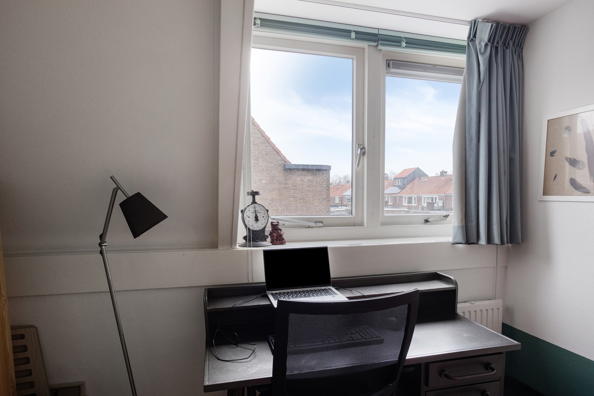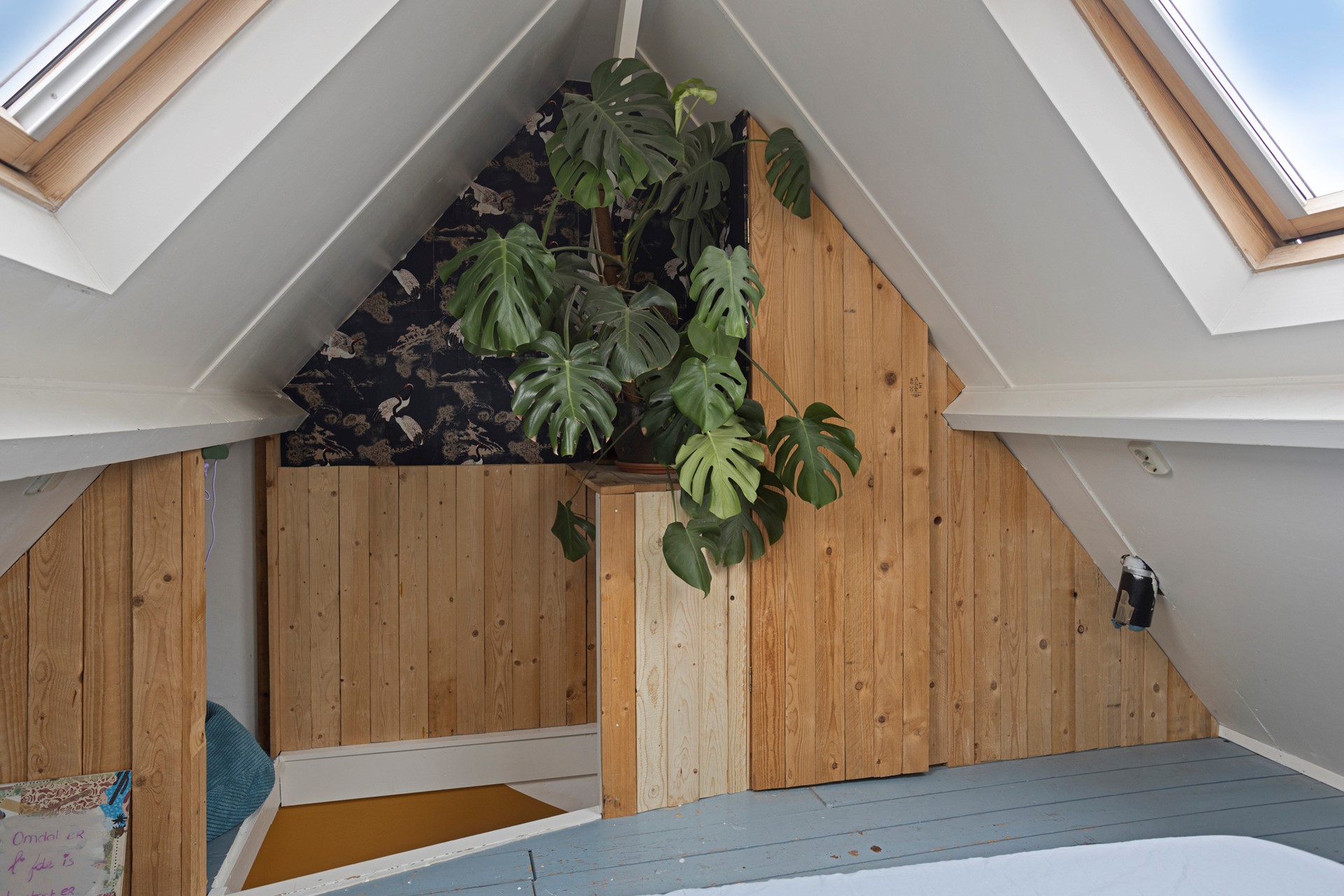 Via de vaste trap naar de tweede verdieping kom je in slaapkamer 3. Onder een goed geïsoleerd dak met veel dakramen is het goed slapen. De eigenaar heeft oude kastdeuren zonnig geel geschilderd en daar een hele leuke kastenwand mee gemaakt. Hier boven is ook een ruimte voor de CV ketel.