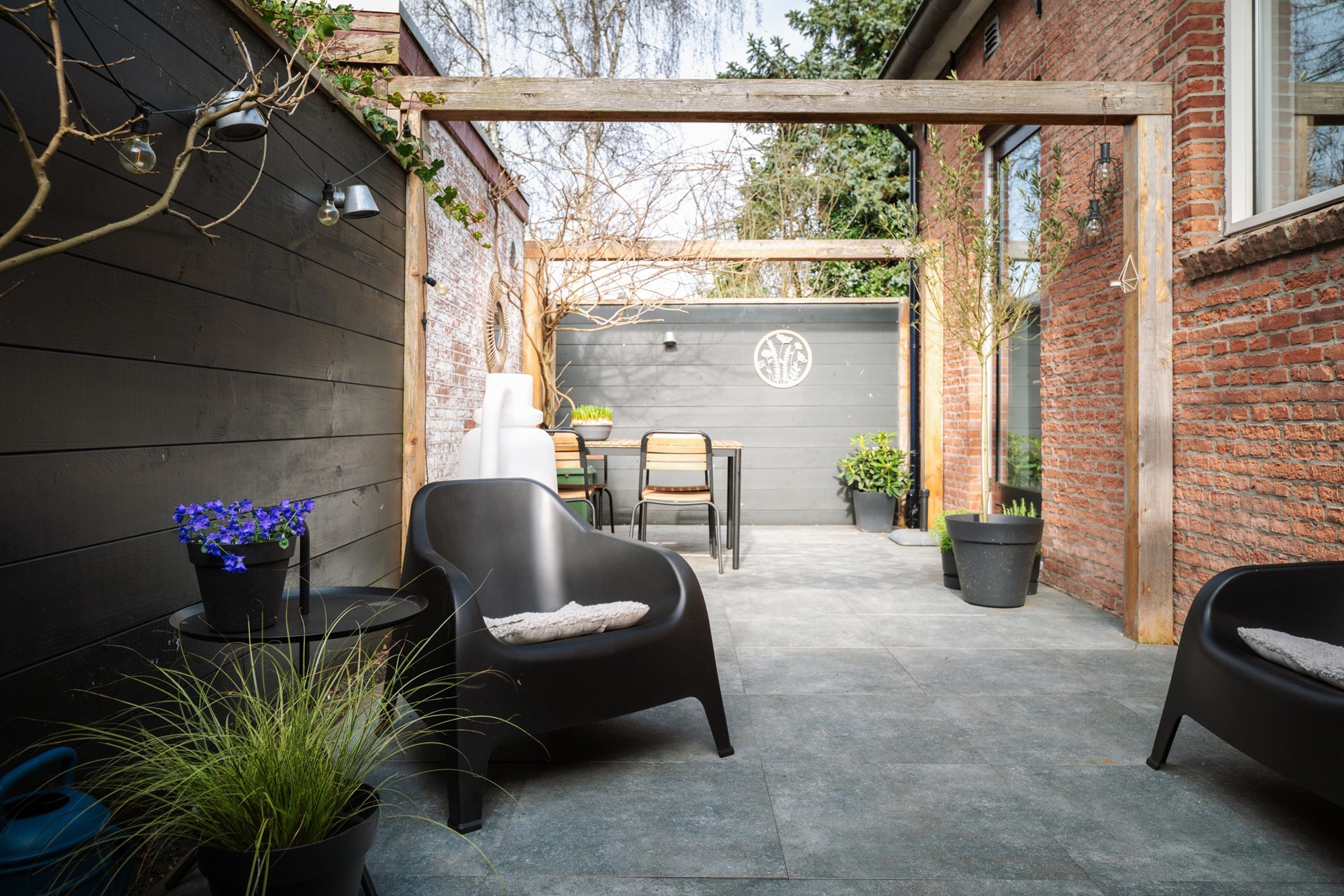 Linksaf is een waanzinnige woonkamer, ooit de deel, met een gietvloer met vloerverwarming en enorme deuren waar het zonlicht lekker door naar binnen valt. Je wordt hier gewoon vanzelf vrolijk, zonder enige moeite kan je je voorstellen dat hier menig feestje gevierd wordt. Op het "podium" is de keuken met een kook/spoeleiland en veeeeel kastruimte. In het podium is een verrassing ingebouwd: een professionele muziekinstallatie! Een feest voor je oren en hé, je woont hier vrijstaand, dus het volume mag soms best iets hoger. Van uit de keuken loop je de besloten terrastuin in. De tuin ligt heel gunstig, precies aan de zuid- en westkant van het huis. Al vroeg in het jaar kan je hier lekker buiten zitten. Net als het hele huis is ook de tuin prachtig ingericht. Precies wat je wilt, lekker genieten en weinig onderhoud.