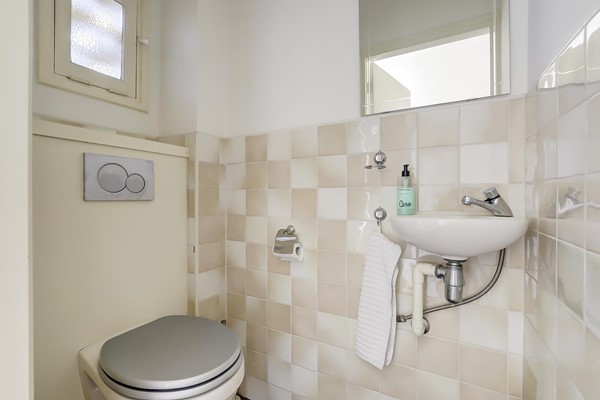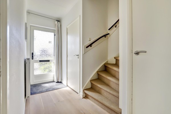 Er is een flinke oprit en een diepe voortuin met volwassen platanen voordat je bij de voordeur komt. Je komt binnen in de hal met toilet en trapkast.