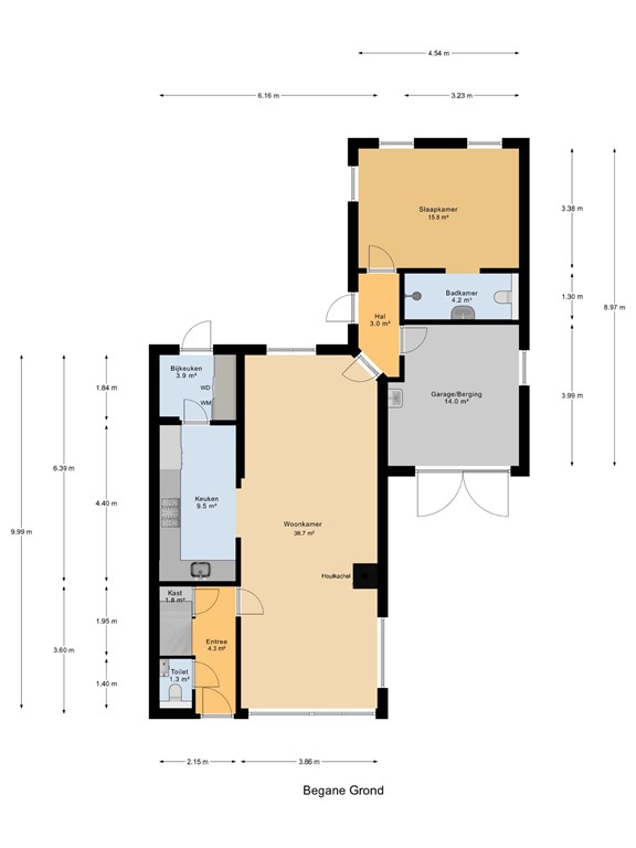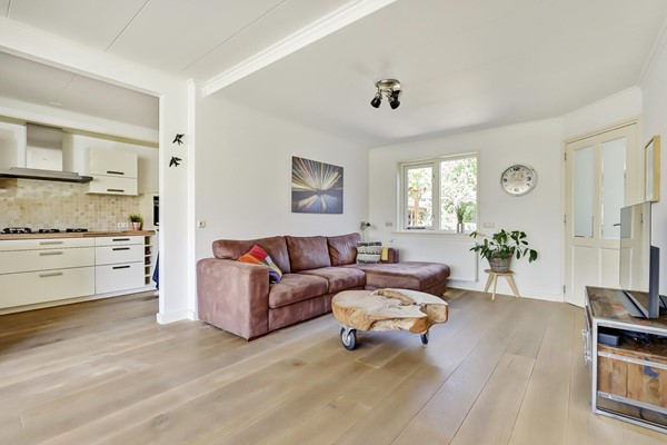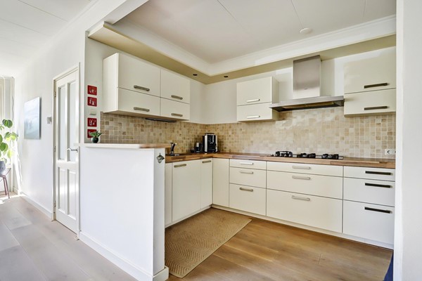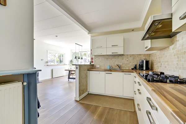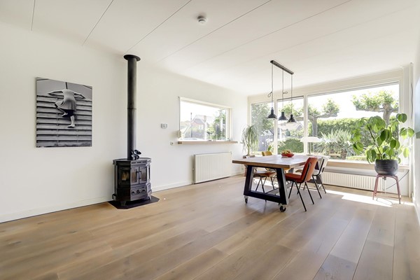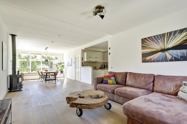 Doordat het huis flink is uitgebouwd aan de achterkant, is de woonkamer bijna 40 m2. Op de vloer liggen massieve eikenhouten planken en halverwege de kamer staat een robuuste houtkachel. Of je je zithoek nu voor- of achterin de kamer plaatst, er is voldoende ruimte voor elke opstelling die je wilt. De half open keuken is 10 m2 en heeft alle benodigde inbouwapparatuur. Erg prettig is ook de aangrenzende bijkeuken met de aansluitingen voor wasapparaten.