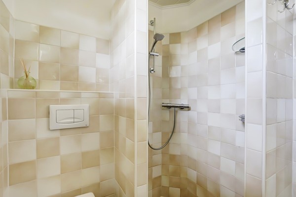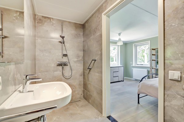De tweede deur leidt naar de ruime slaapkamer met aangrenzende badkamer met wastafel, douche en toilet (2024).