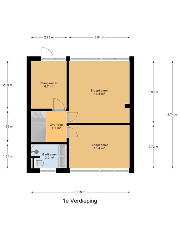 Op de eerste verdieping zijn drie slaapkamers en een compacte badkamer met twee wastafels, een inloopdouche en een toilet.